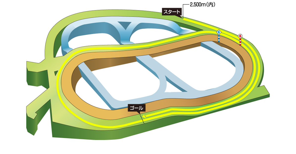 コーナー6つの特殊なコース。激しい消耗戦になりやすく、スタミナが問われる。ハイレベルなレースになるほど、ラストスパートの地点が前になり、有馬記念では2コーナーの出口付近からペースが上がる。そのため、基本的に上がりがかかりやすいレースとなる先行できる馬の方が圧倒的に有利で差し・追い込み馬は、かなりの力がないと勝つのは難しい。逃げ、先行馬ならばできるだけ内枠が欲しい。