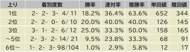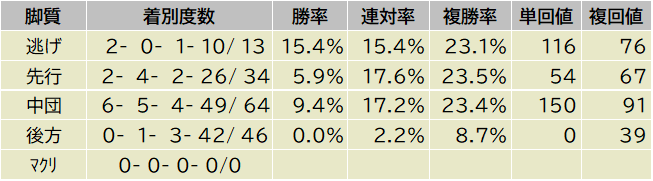 - ラスト2F連続で減速するレースかラスト2F連続で減速するレースまたはラスト1Fで0.6秒以上減速するレースを4角5番手以内から上がり4位以上で優勝またはミドルペースからハイペースのレースを上がり最速で優勝