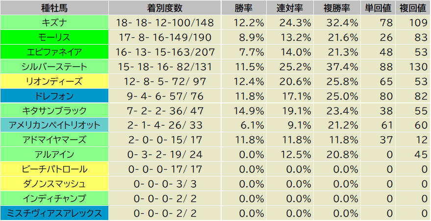 キズナ産駒・シルバーステート産駒の成績が優秀。