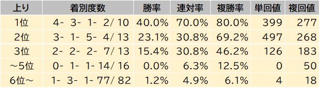 先行・中団から末脚を活かす競馬をした馬の期待値が高い。
